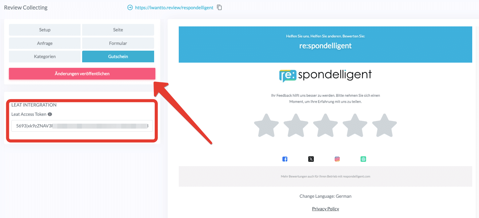 Um die Gutschein-Funktion zu nutzen, verbinden Sie zunächst IWantTo.Review mit Ihrem Leat-Konto. Dafür benötigen Sie einen Access Token.