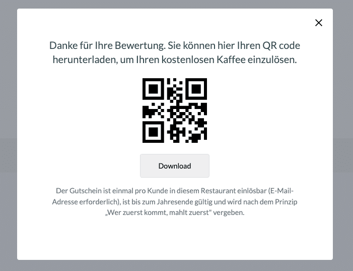 Nach Klick auf “Zum Gutschein” wird automatisch ein QR-Code erstellt, den der Gast direkt herunterladen und Ihrem Team zum Scannen vorzeigen kann.