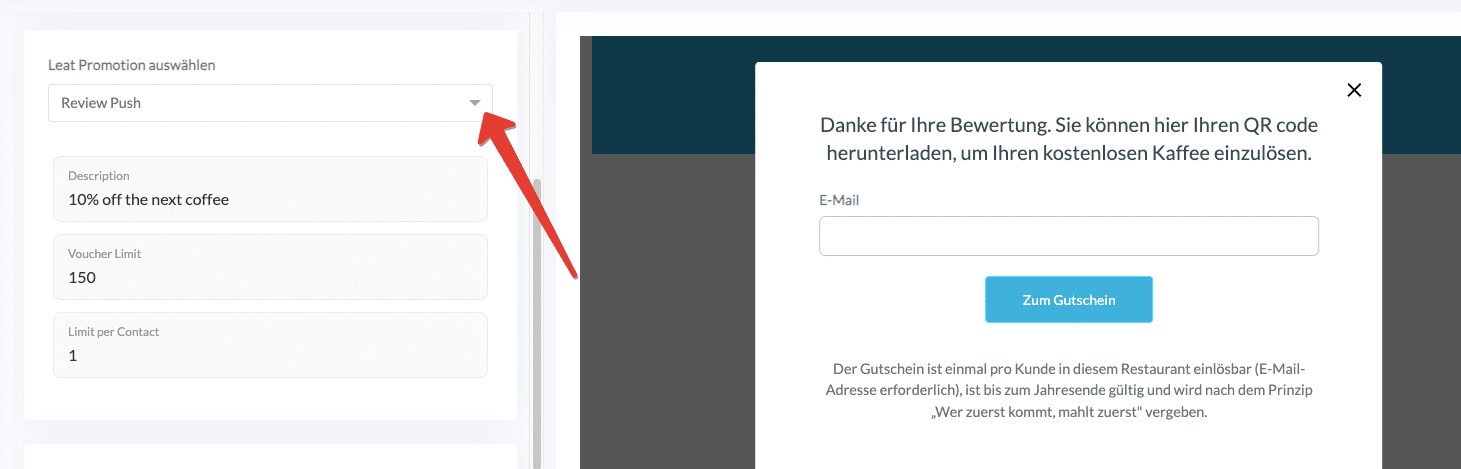 Erstellen Sie nun die Promotion, die Ihre Gäste als Belohnung für ihr Feedback erhalten sollen. Sie können in Leat entweder eine neue Promotion anlegen oder eine bestehende verwenden.