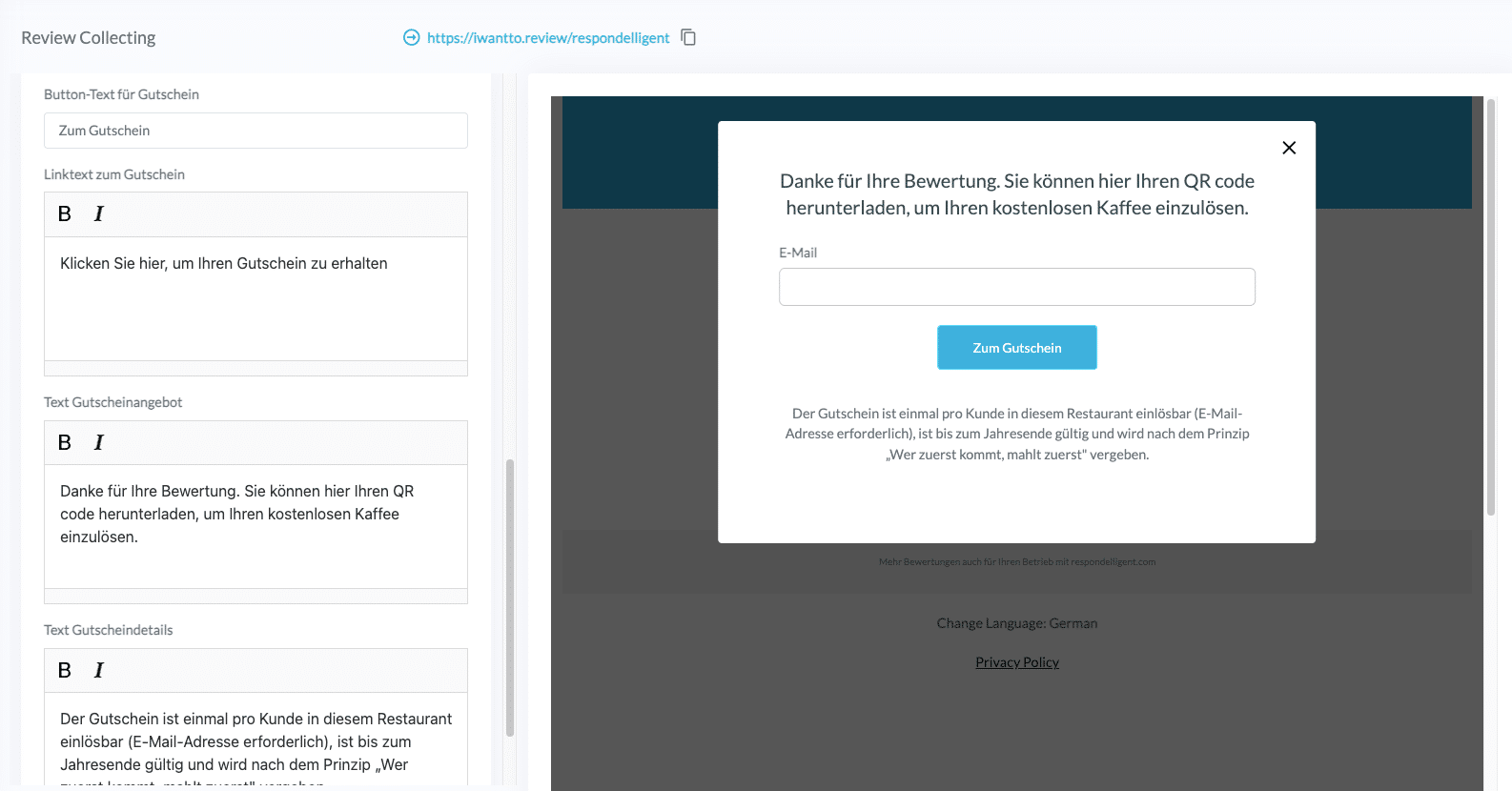 Mehrsprachigkeit: Falls User eine andere Sprache auswählen, werden die Gutschein-Texte automatisch mit übersetzt – genau wie der Rest Ihrer IWantTo.Review-Seite.