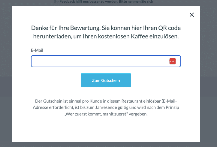 Wenn ein Gast auf “Gutschein erhalten” klickt, wird er aufgefordert, seine E-Mail-Adresse anzugeben.