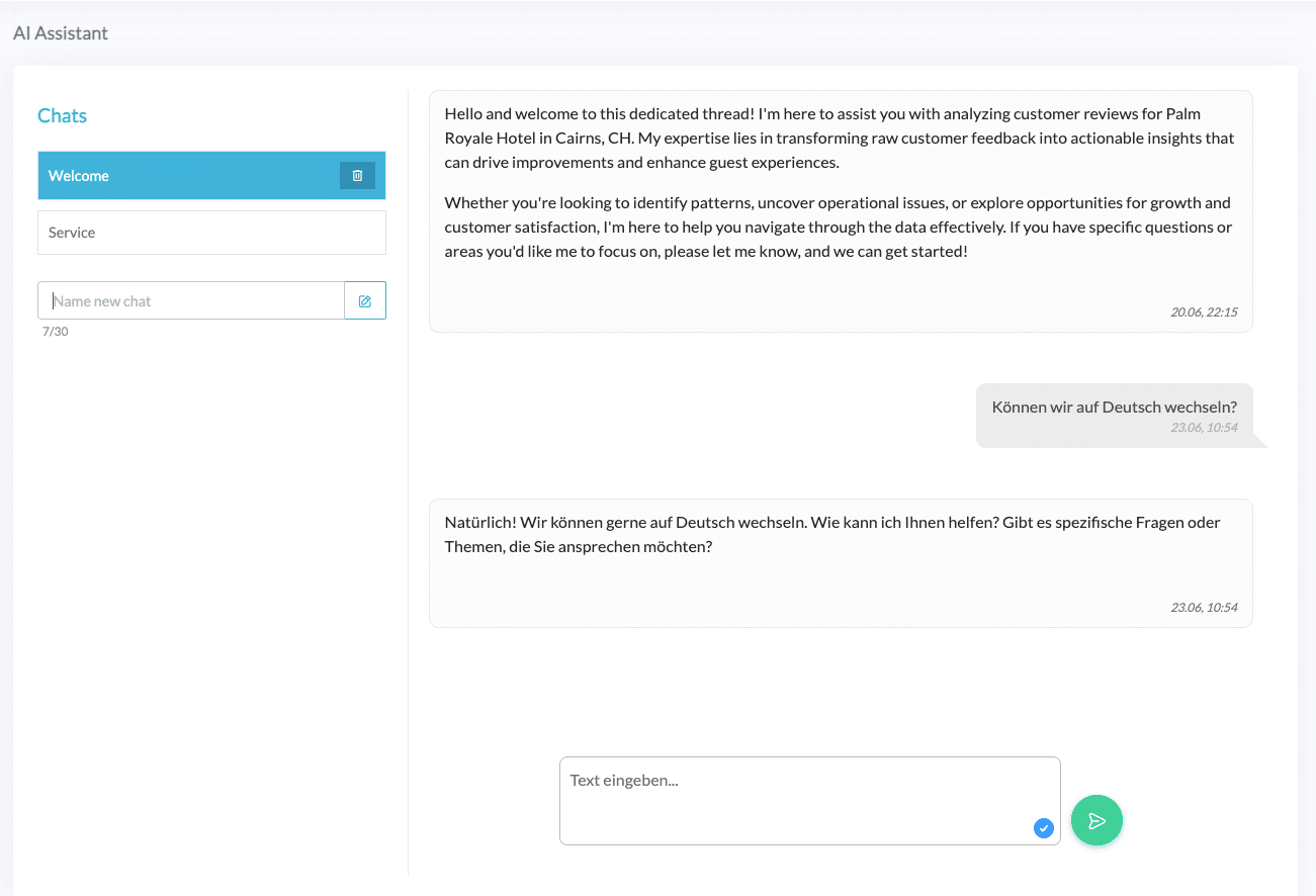 Standardmässig ist ein neuer Chat, ein sogenannter Thread, aktiviert, mit dem Titel “Welcome”. Sie können entweder gleich darauflos fragen oder einen neuen Thread erstellen. Schreiben Sie dafür einfach den Thread-Namen in das Feld auf der linkend Seite und drücken Sie Enter.