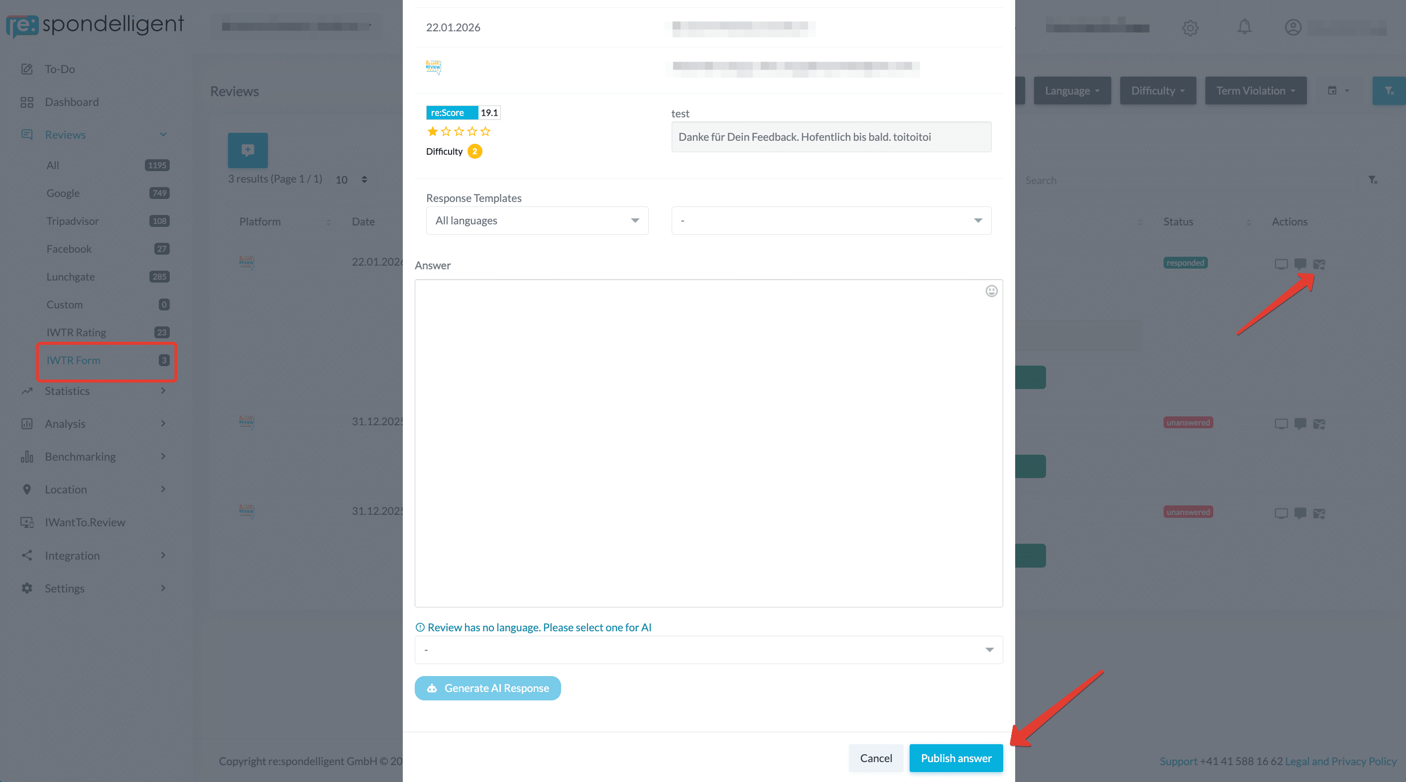 All set! Go back to re:spondelligent – for reviews of the type IWTR Rating and IWTR Form where the guest has provided an email address, you’ll now see a new icon (📩). Click on it to open the response dialog. There, you can write your response, or use our Smart Response Templates and AI response suggestions.