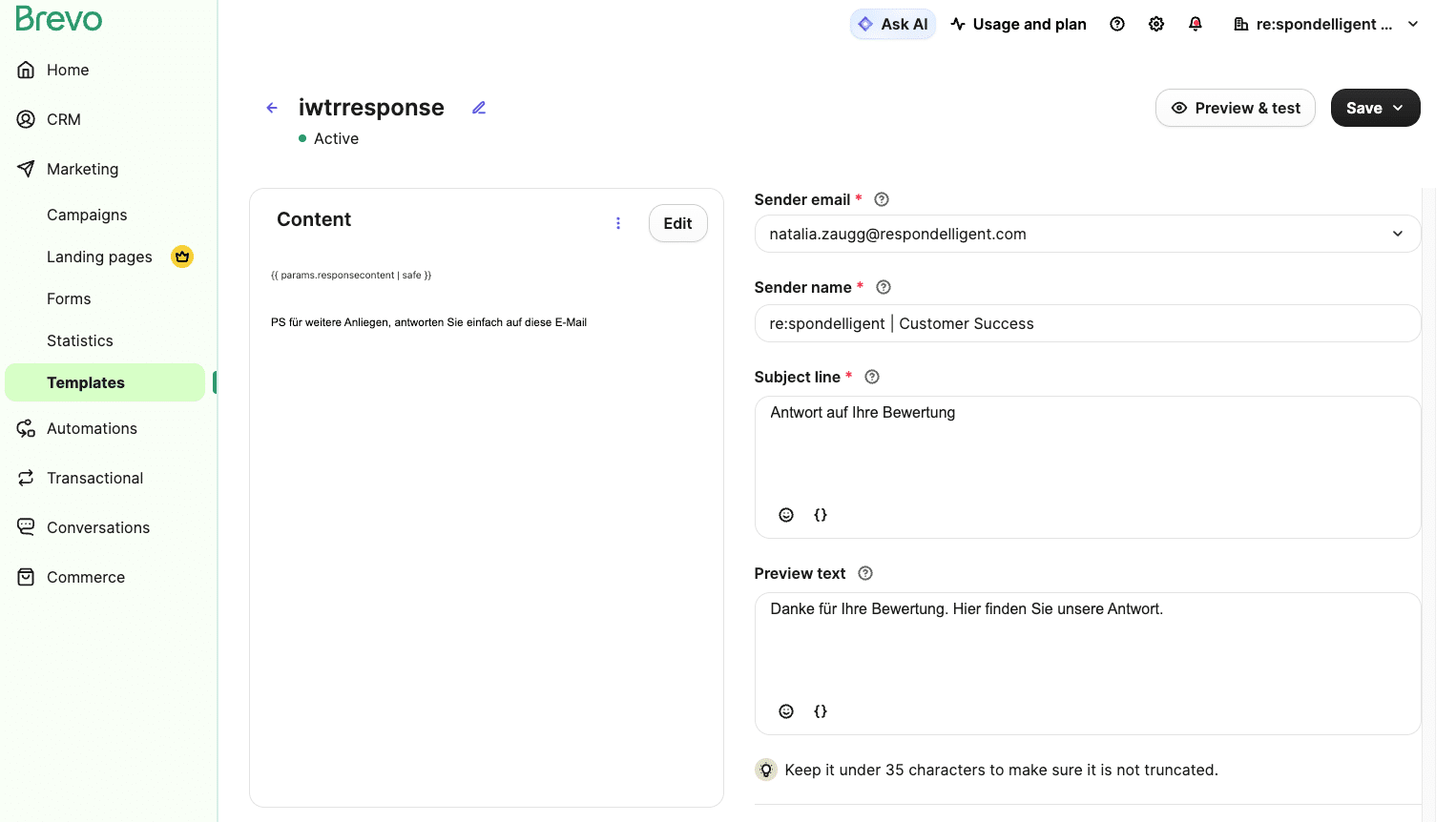 Once you send the response, your text is automatically inserted into the placeholder in your Brevo template, the email is sent to the guest, and the review status in re:spondelligent is set to responded.