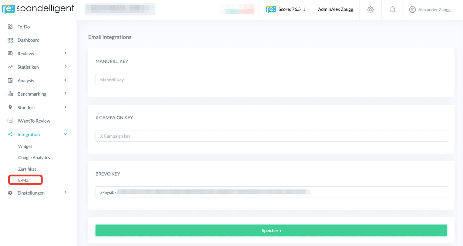 Go to re:spondelligent, navigate to Integration → Email, paste the copied API key, and click Save. Your Brevo connection is now established.